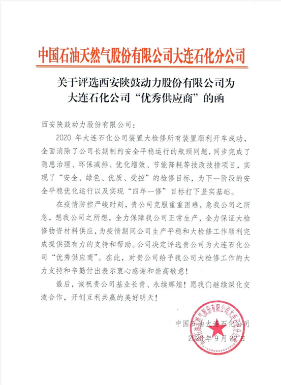 近日,中国石油天然气股份有限公司大连石化分公司公布了“2020年优秀供应商”评选结果,星空电竞从众多供应商中脱颖而出,被评为2020年疫情保供暨装置大检修“优秀供应商”,这也是用户在维保服务领域评选出的唯一优秀供应商。
